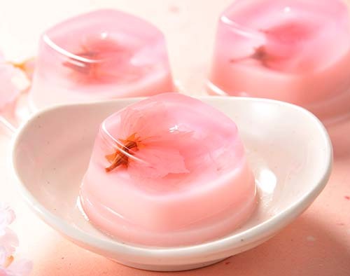 国産の桜の花びらを使用して、きれいにプリンの中に閉じ込めました。