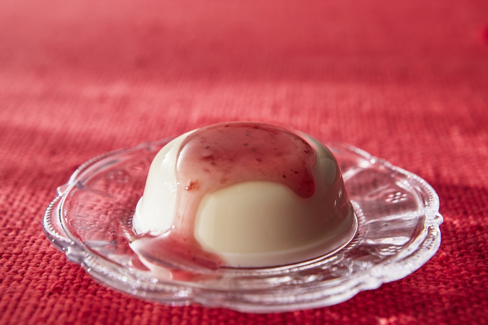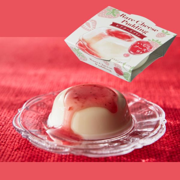 濃厚でなめらかな口溶けのレアチーズプリンに、甘酸っぱい苺ソースを添えました。