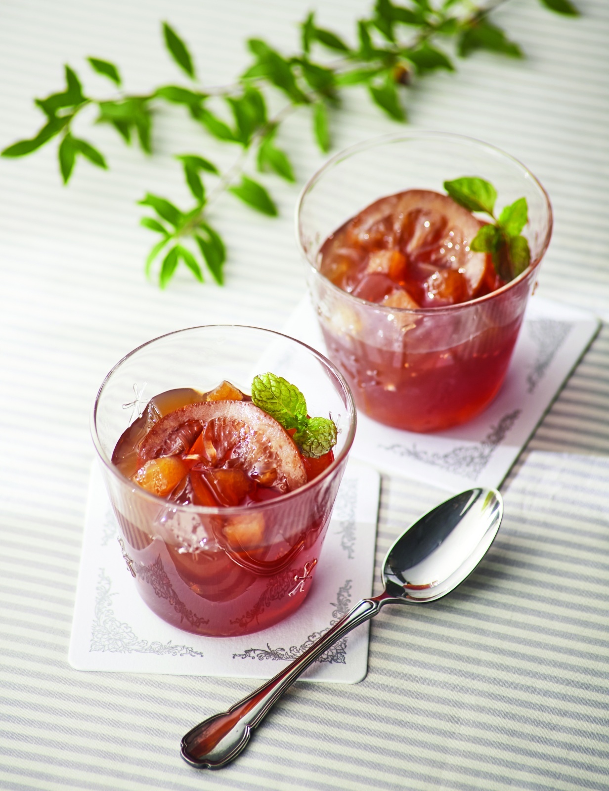 アールグレイの香りを閉じ込めたレモンティーゼリーに、輪切りの瀬戸内レモンとダイスカットの林檎を入れました。