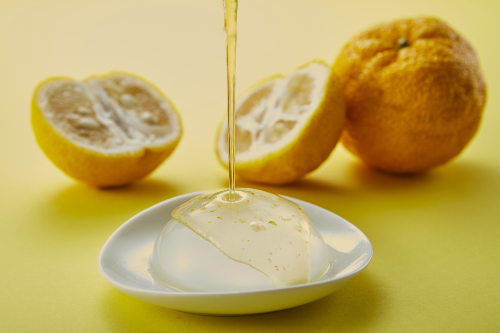 甘酸っぱい柚子の特製ソースを、わらび餅の生地にかけてお召し上がりください。